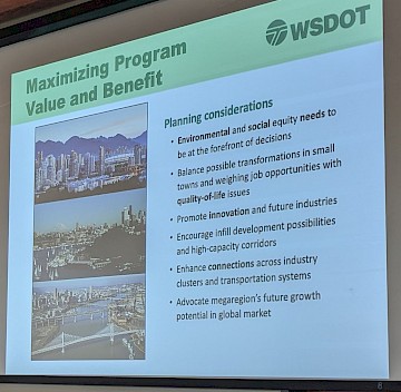 Discussion of transportation options for the North Sound region (Whatcom, Skagit, San Juan, Island, and Snohomish Counties).