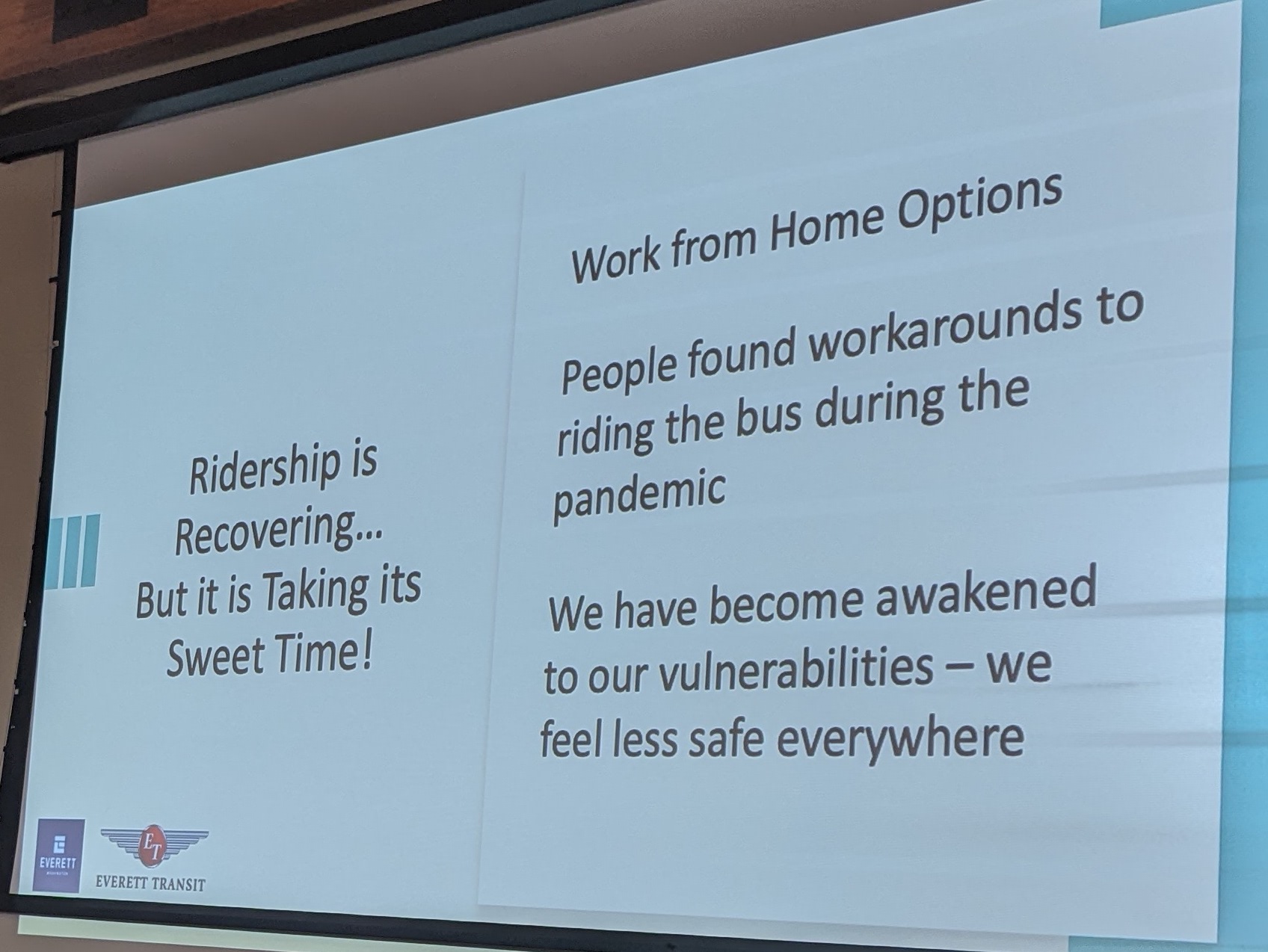 - Does transit have long-COVID? Ridership trends and scenarios going into 2023 — Shawn Harris, Island Transit; Tom Hingson, Everett Transit; Tim Wilder, Whatcom Transportation Authority; Brad Windler, Skagit Transit