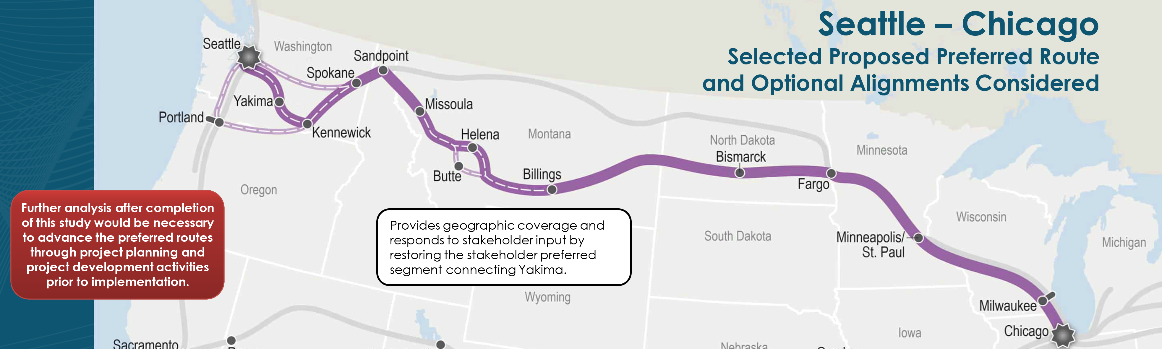 The Federal Railroad Adminisation has recommended re-starting service from Seattle to Chicago via Stampede Pass, Pasco/Kenewick, and Spokane, then on to southern Montana, North Dakota, Minnesota and Wisconsin. In addition to the locations listed on the FRA's map below, towns such as Auburn, Cle Elum, Ellensburg, Toppenish, Ritzville, Prosser, and Cheney could also be served, either by long-disance or state-supported service.