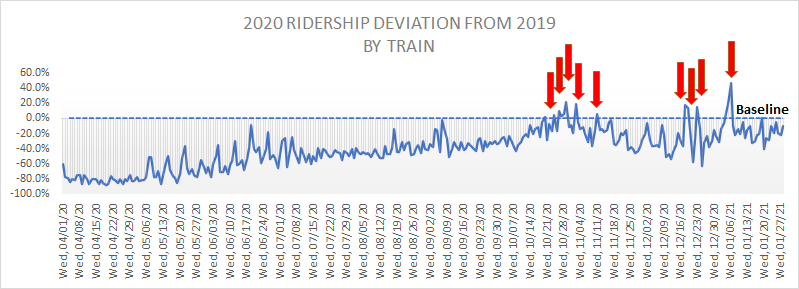 To summarize, presently the state is operating 2 daily trains, as opposed to 14 daily trains as it did one year ago. By running only 14% of the service with a 50% capacity cap, it should surprise nobody that only about 10% of ridership has been retained.