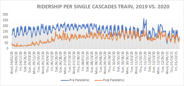 The data posted by WSDOT is presented in a downloadable format, allowing us to use the data for further analysis. What if we look at pre-pandemic ridership versus post-pandemic ridership, and adjust it by train? Taking the 2019 ridership figure, and dividing it by 14 (trains), while dividing the 2020 ridership by 2 (trains), gives us a profile of the average ridership of a single Cascades train, pre and post-pandemic:
